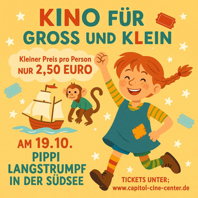 Erleben Sie ein unvergessliches Abenteuer im Capitol Cine Center in Preetz! Am 19.10. zeigen wir im Kinderkino 'Pippi Langstrumpf in der Südsee'. Tauchen Sie ein in die bunte Welt von Pippi – und das für nur 2,50 Euro pro Person. Sichern Sie sich Ihre Tickets und genießen Sie einen spaßigen Familiennachmittag!